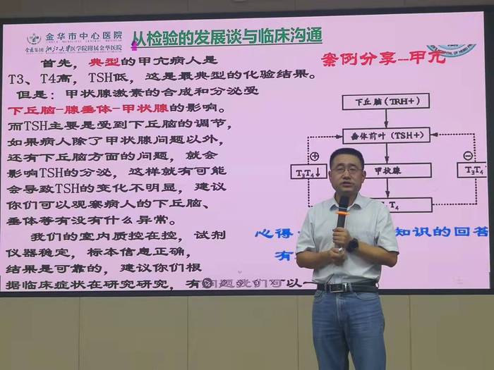 讲座伊始,马拥军从自身从业30多年的经验出发,向师生讲述了作为一名医学检验技术人员应该具备的职业素养。他通过介绍金华市中心医院的基本情况,让大家知道了检验科在医院的重要性;通过阐述检验医学的现状和发展趋势,让大家对医学检验技术专业有了更为清晰的认识。最后,他殷切希望学弟学妹们都能成为既有高度的责任心,时刻为患者着想,又有扎实的知识和技能储备,能为医学检验的发展做出贡献的人才。整场讲座内容风趣幽默、案例生动形象,现场师生听得津津有味、受益匪浅,为大家今后的职业生涯发展规划指导了方向。