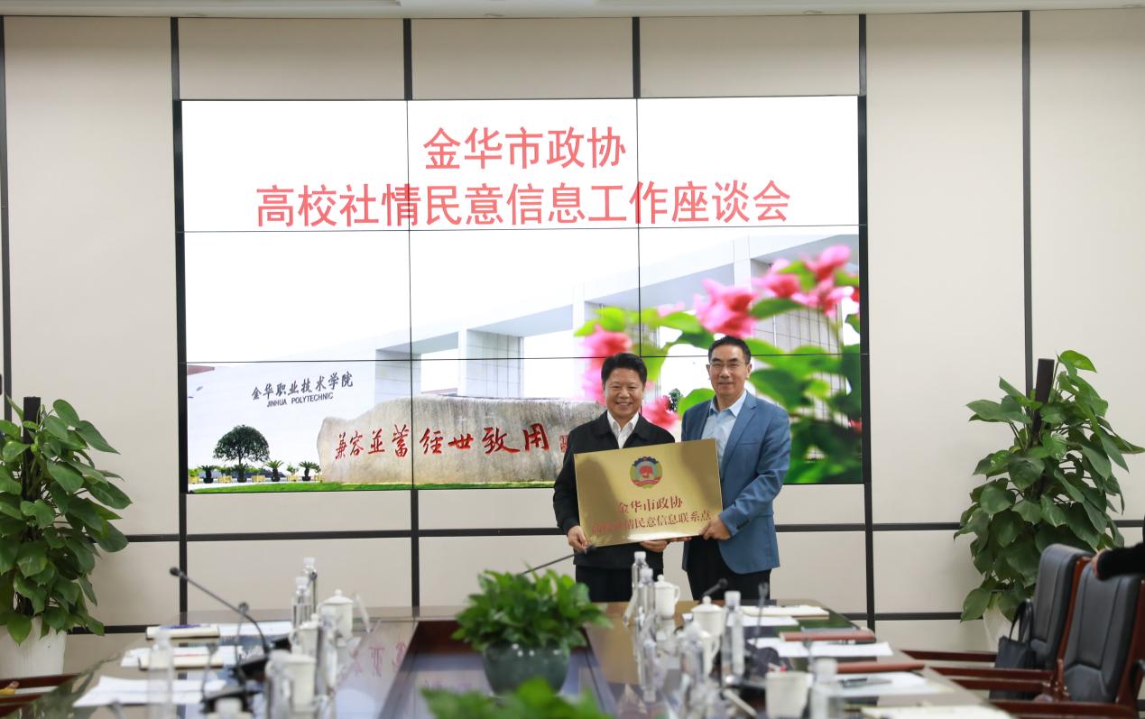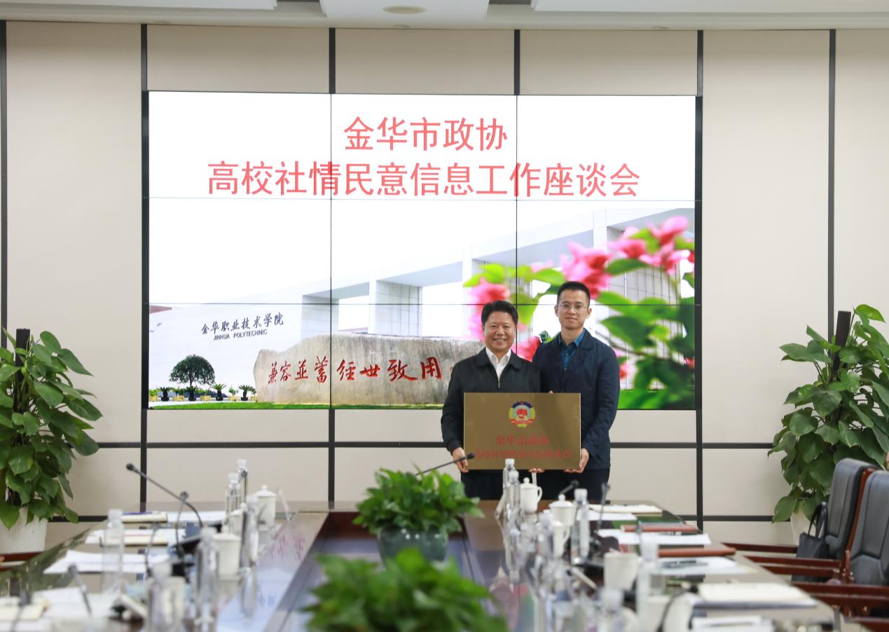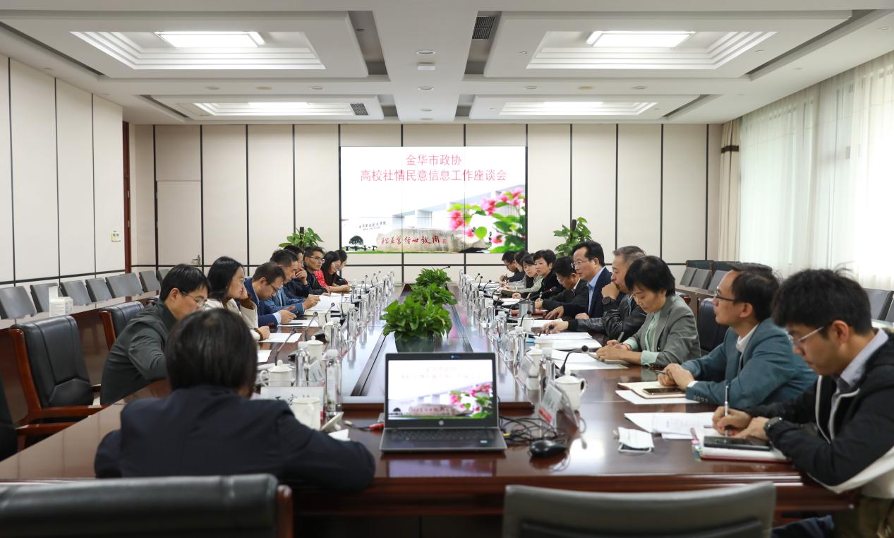 10月27日上午,金华市政协高校社情民意信息工作座谈会在金职院召开。市政协副主席、党组副书记祝伦根,市政协办公室、浙江师范大学、上海财大浙江学院、浙江大学金华研究院智库中心相关人员,金职院党委书记王振洪,党委副书记龚永坚,党委委员、宣传统战部长胡彦及市政协委员代表、宣传统战部有关人员参加会议。会议由市政协副秘书长张勤主持。