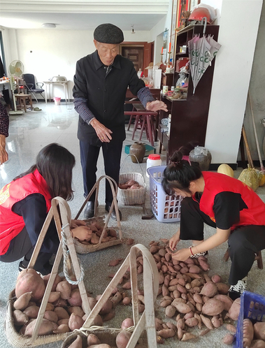 在武义县西联乡大溪口村,医学院中药学专业的同学们寻访红色根脉,请教专业前辈。志愿者们敲开当地“光荣之家”的家门,老人对于志愿者们的到来非常开心,志愿者们一边帮助老人们剥豆子、挑红薯,一边听老人为大家讲述自己20余年在部队的经历。