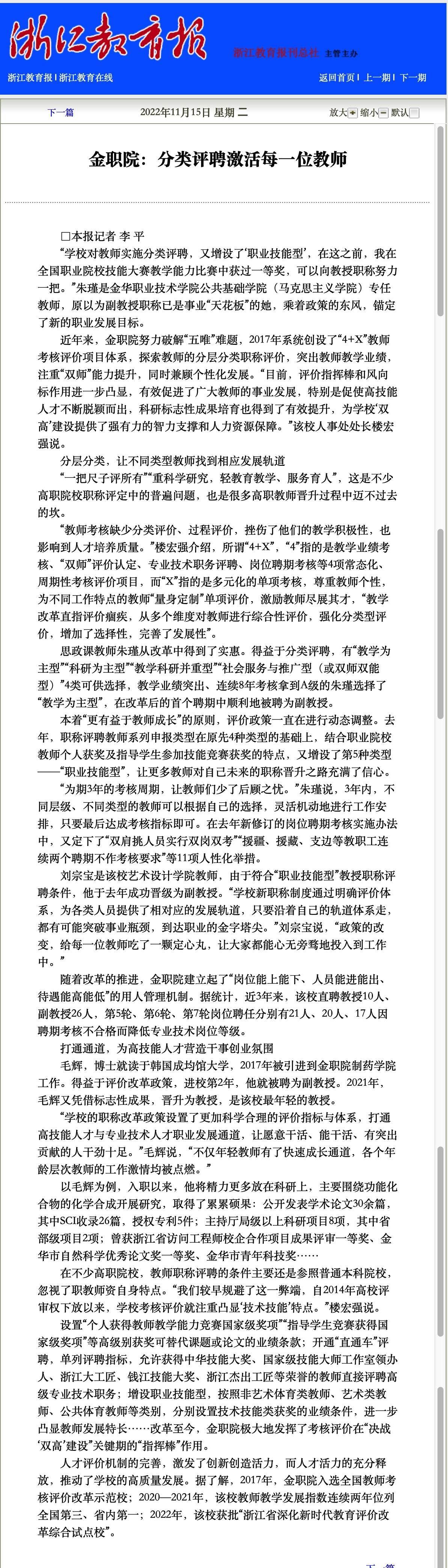 浙江教育报:金职院:分类评聘激活每一位教师