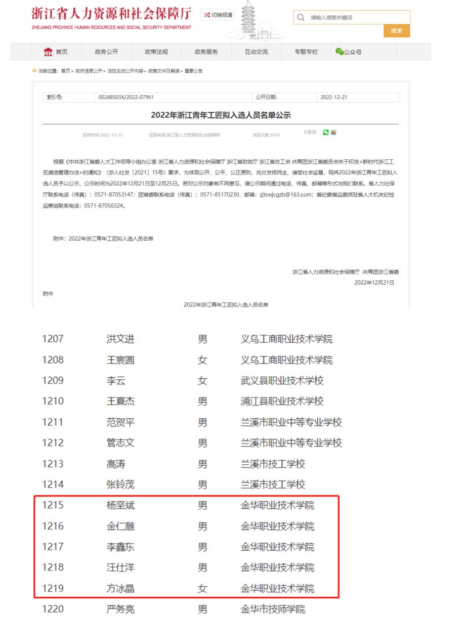 近日,浙江省人力资源和社会保障厅和共青团浙江省委公布了《2022年浙江青年工匠拟入选人员名单公示》,金职院杨坚斌、金仁雕、李鑫东、汪仕洋、方冰晶等5名教师成功入选。