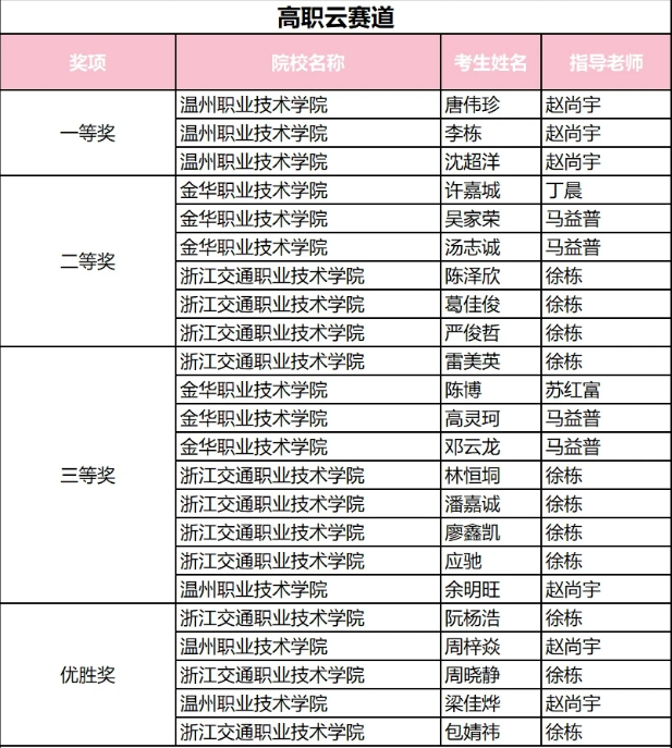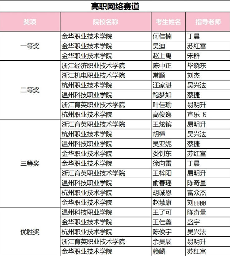 近日,在华为ICT大赛2022-2023中国区浙江省实践赛中,金华职业技术学院信息工程学院学子斩获多个奖项。信息工程学院通信与网络技术专业积极组织各专业学生参赛,其中网络专业何佳楠、物联网专业吴迪、赵上禹3位同学喜获网络赛道获一等奖,将代表浙江省赛区参加国赛;网络赛道娄钊东、徐向雷、赵慧康、王佳鑫、赖麟5位同学喜获三等奖。云赛道许嘉城、吴家荣、汤志诚3位同学喜获二等奖;陈博、高灵珂、邓云龙3位同学喜获三等奖。