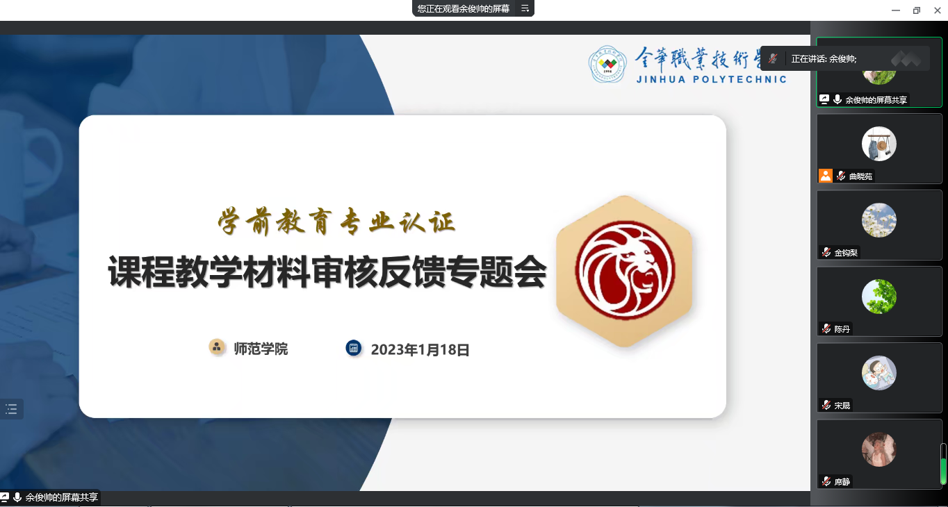 为进一步推进学前教育专业认证工作,反馈并整改课程材料中存在的问题,师范学院于1月18日下午召开了专业认证课程材料审核反馈会,以线上会议的形式召集课程负责人对课程材料审核情况进行反馈、研讨。师范学院负责人、学前教育专业相关主任、课程组长、相关课程负责人参加了会议。