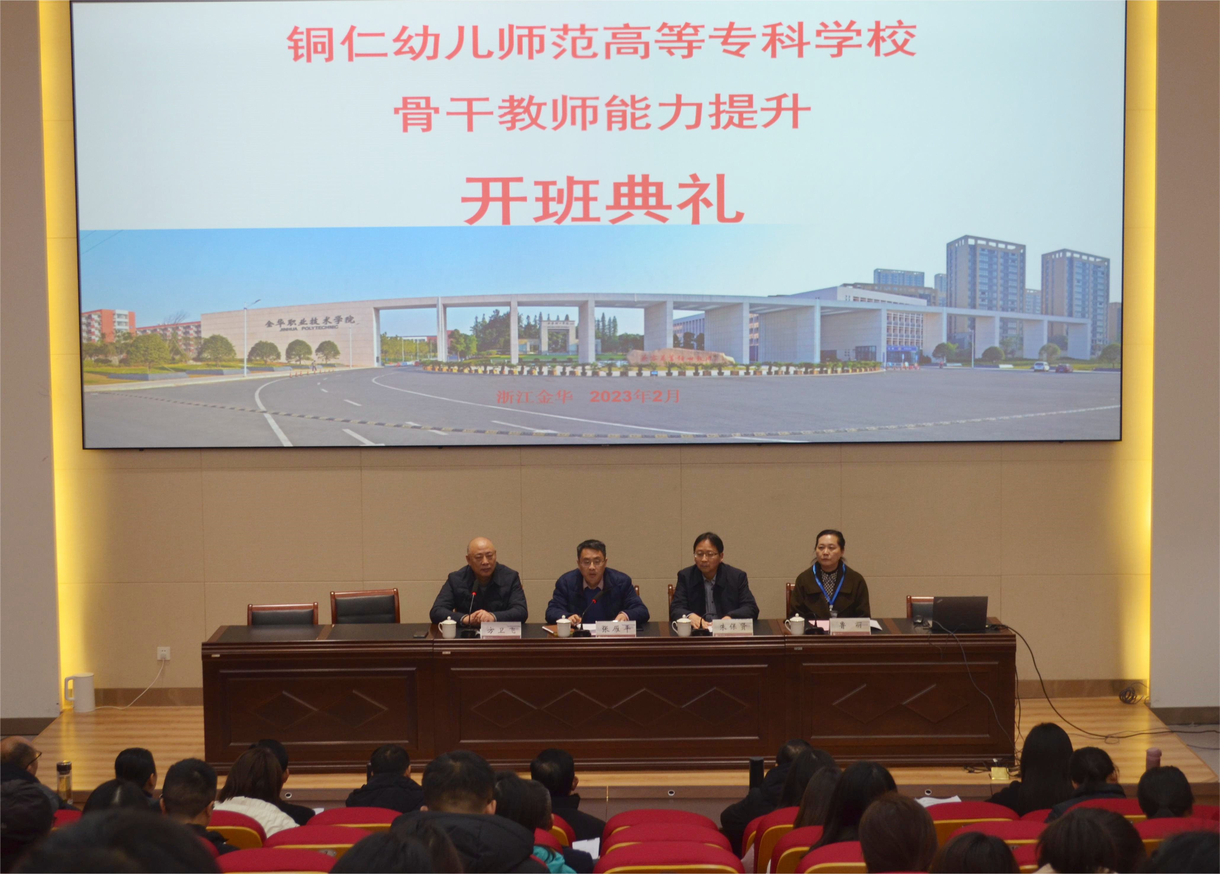 2月13日上午,铜仁幼儿师范高等专科学校骨干教师能力提升培训班在金职院开班。铜仁幼高专校长朱保贤、副校长鲁丽,金职院副校长张雁平、师范学院相关负责人,铜仁幼高专52位领导和学员共同参加了开班仪式。