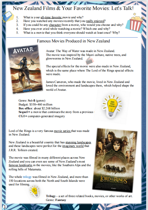 活动先由外教向同学们介绍了新西兰著名电影《阿凡达》《指环王》与《霍比特人》,再就电影的种类、电影描述、及影评的重点词汇与句式进行教学。接着,同学们在外教的带领下,围绕自己感兴趣的电影题材、人物类型、观后感受等方面依次介绍了自己喜爱的电影。最后,以新西兰电影文化为契机,师生们共同观看了原声电影《阿凡达2》,同时就电影中的特效、情节、人物、主题等展开英语讨论,全场气氛热烈。
