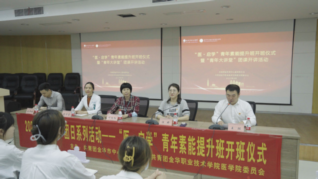 金华市中心医院副院长叶向红、护理部副主任周叶青、团委书记鲍群雄、临床护理学院学生,金职院医学院党委相关负责人、团委负责人、团学骨干、基层团支部学生团干等80余人参加。与此同时,在学校医路仁家杏林学堂的分会场,来自医学院大一23个团支部的团员代表通过现场直播连线观看此次开班典礼。