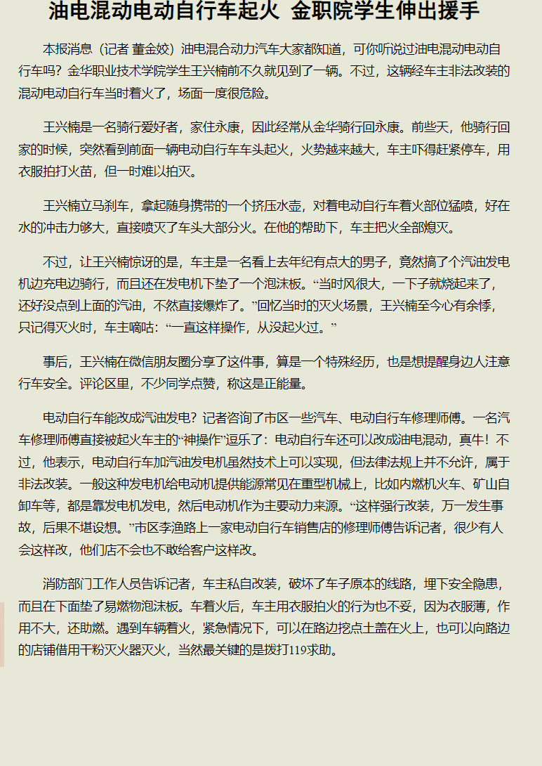 金华日报:油电混动电动自行车起火 金职院学生伸出援手