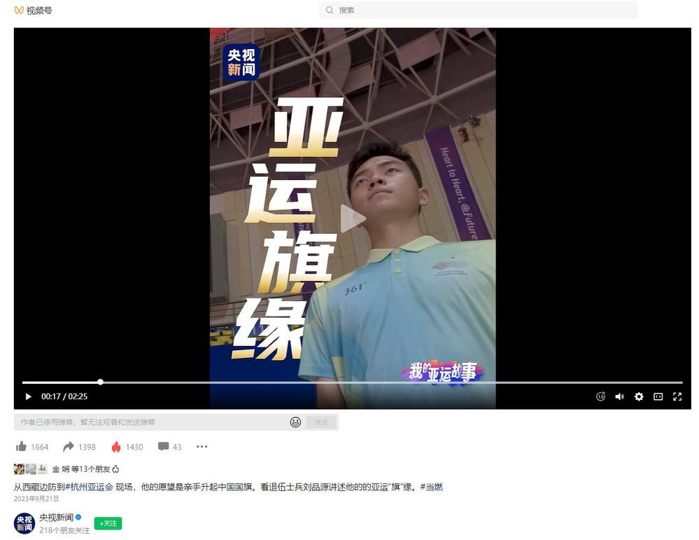 央视新闻视频号:从西藏边防到#杭州亚运会 现场,他的愿望是亲手升起中国国旗。看退伍士兵刘品源讲述他的的亚运“旗”缘。#当燃