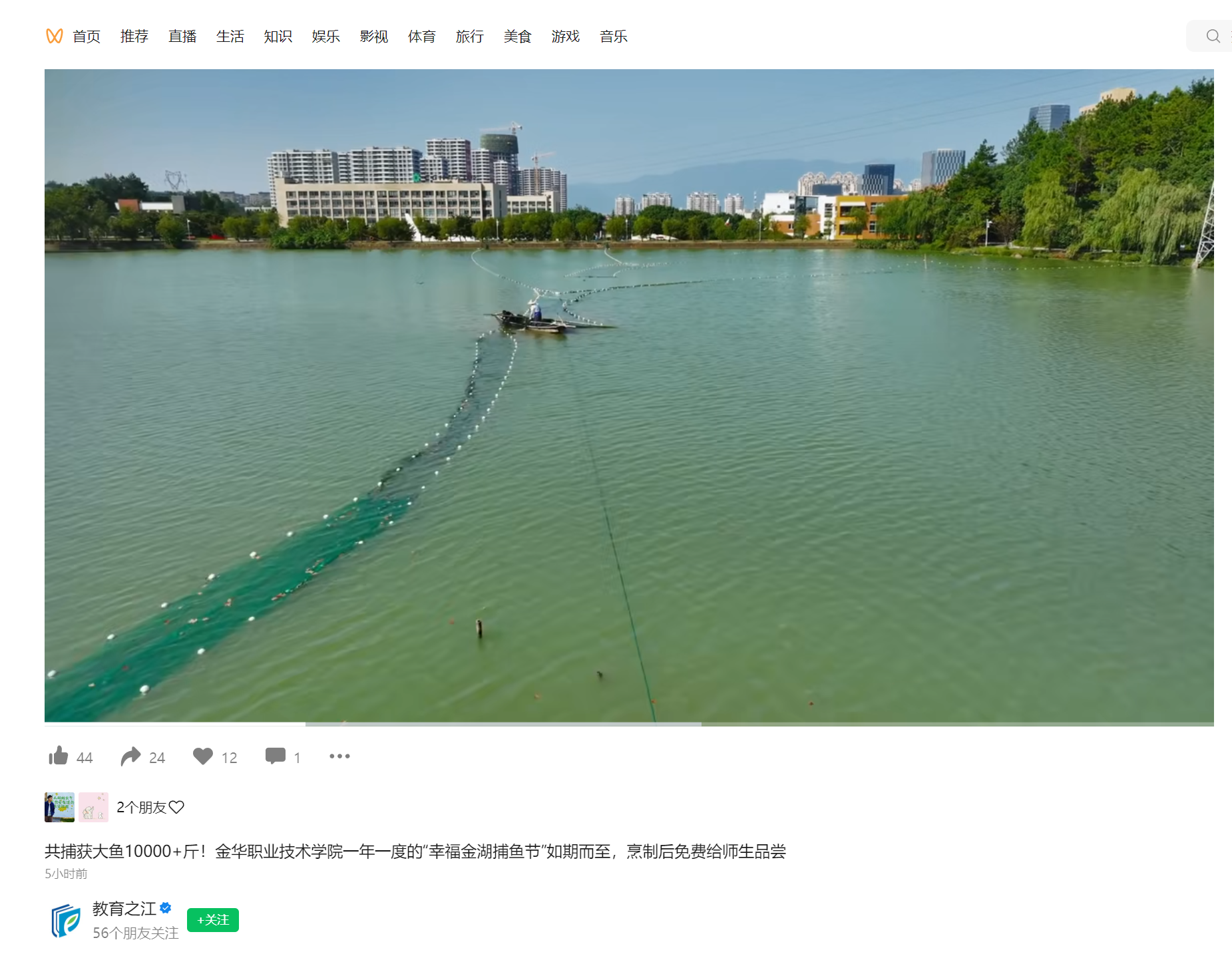教育之江:共捕获大鱼10000+斤!金华职业技术学院一年一度的“幸福金湖捕鱼节”如期而至,烹制后免费给师生品尝