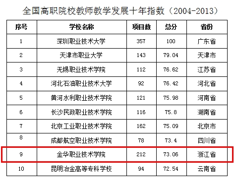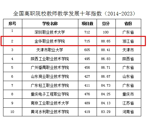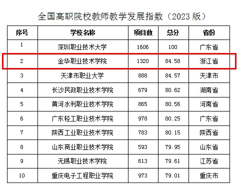 近日,中国高等教育学会正式发布“2023版全国普通高校教师教学发展指数”,受到了社会各界的广泛关注和高度评价。金华职业技术学院以84.58的总分,在“全国高职院校教师教学发展指数(2023版)”中攀升至第二位,继续保持省内第一。