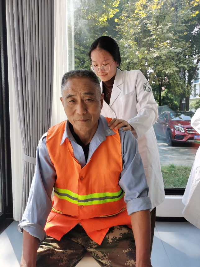 活动现场,医学院仁心康复协会的同学们设置了一个按摩服务点,采用滚法、推法、拿法、捏法等多种手法,给环卫工人们康复理疗,帮助他们缓解疲劳,并送上小礼品,为他们送上了节日的祝福和温暖。“叔叔,我这样按摩的力度,感觉怎么样?”此次活动的学生负责人娄锦凤一边与其交流日常工作,了解他们的劳损部位,一边进行肩颈部按摩康复,以自身专业所学为大家服务。室外保洁组的张大叔微笑着说,竖起大拇指夸赞学生志愿者:“同学们专业技能很扎实,按得很舒服,一天的疲劳都烟消云散了!我感到很幸福,感谢贴心的同学们!”