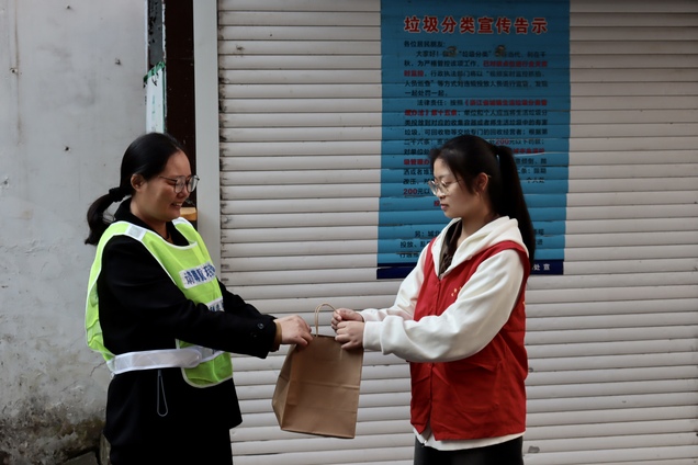 一抹靓丽“橙”温暖一座城。连日来,在学校附近的马路边、社区街道,医学院仁心康复协会的学生志愿者们还开展“情系环卫工 礼品送爱心”主题活动,不仅提供康复理疗服务,而且还送上暖心礼物。“阿姨,日常工作辛苦啦!这是我们准备的水、劳保手套和护手霜,希望您多补充水分,注意身体保养。”学生志愿者递出一份份小礼品,环卫工人们接过礼品,脸上洋溢着开心的笑容,满口称谢同学们的心意。