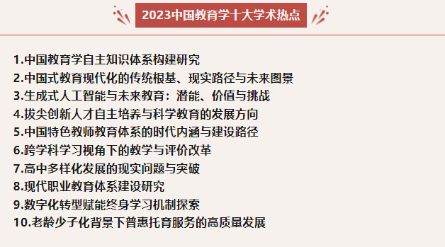 中国教育学会副会长,国家教育治理研究院院长,华中师范大学教授周洪宇,苏州大学党委常委、副校长李孝峰,中国教育报理论文化中心主任杨桂青,中国人民大学书报资料中心党委书记李红宇等领导、专家学者出席会议并致辞讲话,在会上成功发布了“2023年度中国教育学十大学术热点”。本次活动于11月初启动,经过文献梳理、数据统计、学者推荐、专家研讨、网络投票、最终评议等程序,评选出最终结果。