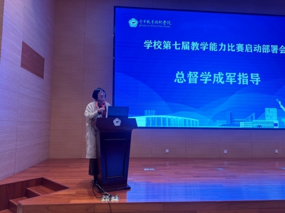 成军在会上深刻剖析了“比赛比什么”、客观分析了“我们赢在哪”,并提出四点期望:一是坚守初心,强化课程内涵彰显育人价值;二是把握规律,回应时代要求优化类型定位;三是勇于创新,求新求真至臻至美不断超越;四是追求卓越,持续课程改革形成质量品牌。她指出,要让教学能力比赛承载更多的价值追求,通过比赛让课程更“新”、课堂更“活”、教师更“强”,以比赛为支点,支撑起学校职业教育“五金”建设新高度。