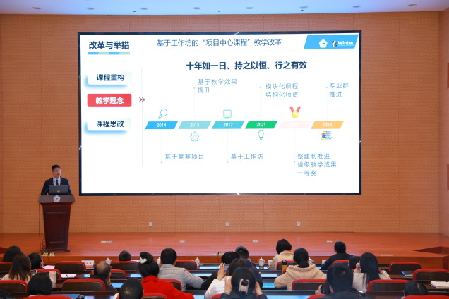 张雁平作了《教学能力比赛备赛的三个进阶-备战2024年教学能力比赛》的报告。他从积极看待教师教学能力比赛、全程保持参加比赛积极状态、科学把握三个阶段备赛要点三个方面对教学能力比赛进行了分析。他以国赛一等奖获奖作品为例,展示了人才培养方案、课程标准、教案、课程实施报告等优秀案例。同时,他要求各团队从国家战略、行业热点、技术发展、区域特色中深入挖掘课程题材,提出有深度的教学理念、理论,提升打造“课程开发范式”或“课堂形态类型”或“教学改革体系”。