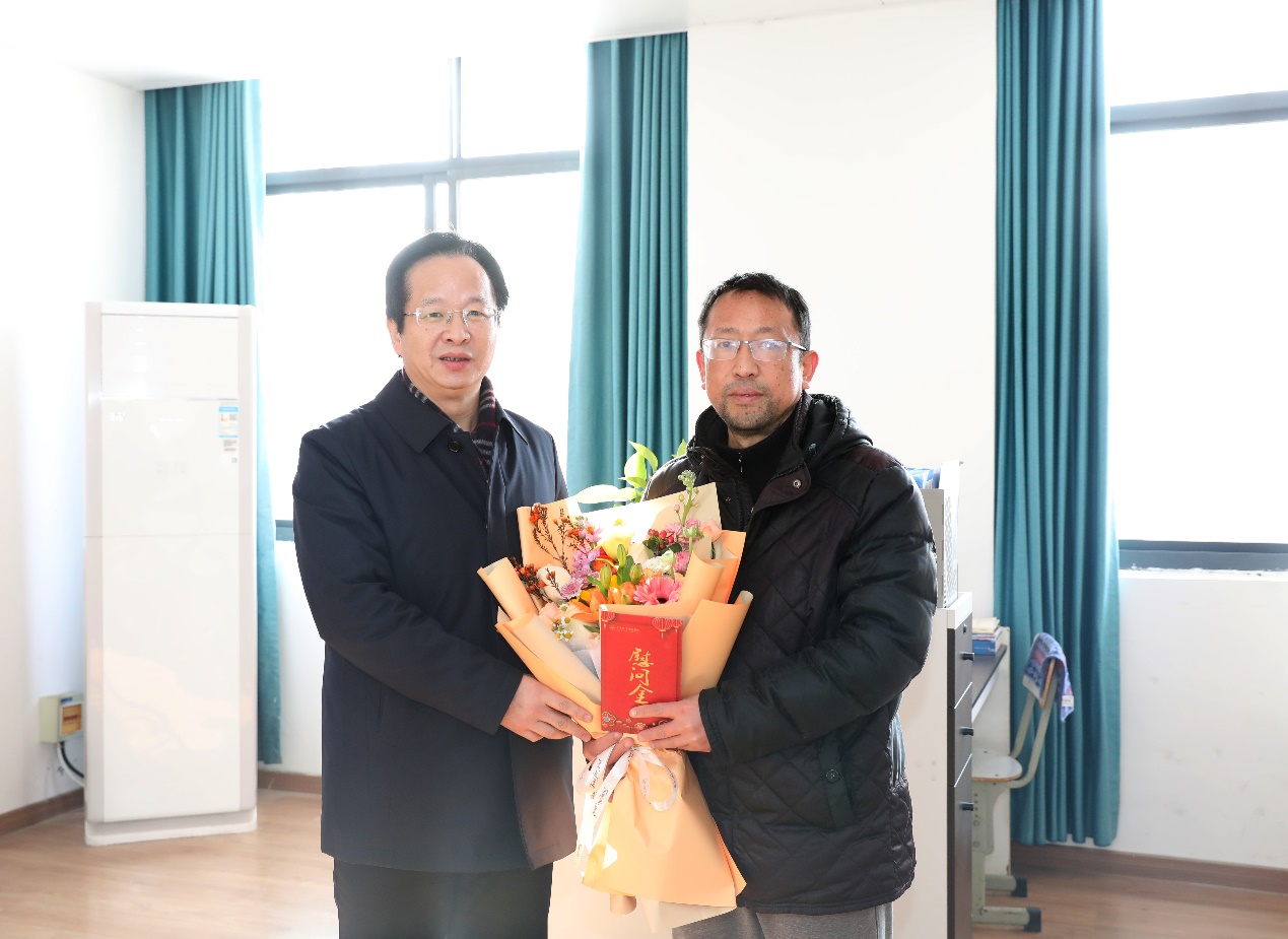 在公共基础学院(马克思主义学院),梁克东一行看望慰问了体育专业教师叶帅,向其致以节日问候和美好祝福,并嘱咐学院领导要多关心关怀一线有需要的教职工。叶帅表示,感谢学校对一线教师的关怀,将以更饱满的热情投入到教学一线工作中,努力争取更好成绩。