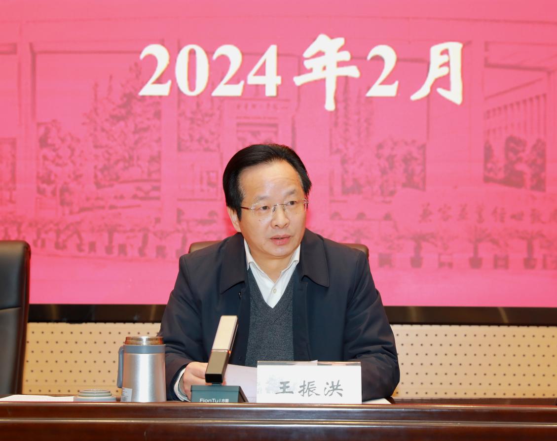 王振洪全面总结了学校主题教育成果。校党委牢牢把握主题主线,做到“五个坚持”高标准推动主题教育开展。坚持责任落实强化组织保障,在凝心铸魂、筑牢根本上实现新加强,加强组织领导、落实专项督查、营造良好氛围,确保主题教育有声势、有特色、有成效;坚持“五学覆盖”强化理论学习,在锤炼品格、强化忠诚上有了新提升,原原本本深学深悟、集中研讨精学精讲、创新形式常学常新,专项行动勤学勤思,推动党的创新理论往深里走、往实里走、往心里走;坚持问题导向深化调查研究,在践行宗旨、为民造福上取得新成效,严把调研“领题关”“破题关”“解题关”精准确定调研选题,高效组织调研实践,集体交流调研成果,破解学校改革发展难题;坚持“四大行动”推动事业发展,在实干担当、促进发展上迈出新步伐,紧紧围绕学校高质量发展首要任务,开展“破难题、促发展”“办实事、优服务”“扩开放、提效能”“赛比拼、勇担当”四大行动,用主题教育明晰方向、提振精神、激发动力;坚持深查细照抓实检视整改,在廉洁奉公、树立新风上展现新面貌,查摆问题“对照改”,完善制度“长效治”,对标先进“重点抓”,坚持边学习边调研边检视边整改,把问题整改与推进学校改革发展相结合,提升主题教育实效。