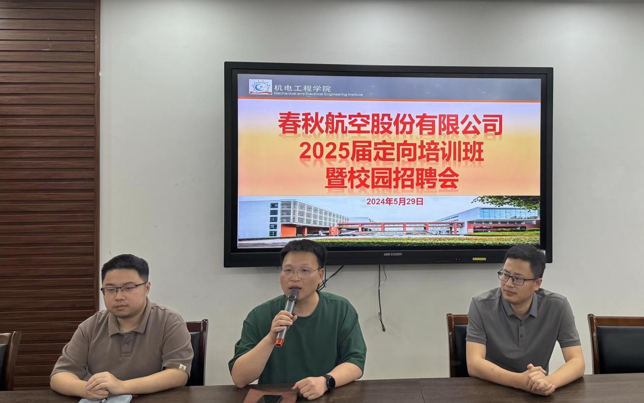 5月29日,机电工程学院(航空工程学院)以“‘春’华‘秋’实,筑梦航空”为主题组织开展春秋航空股份有限公司2025届定向培训班暨校园专场招聘会,飞机机电设备维修专业负责人、学工办就业辅导员和飞机机电设备维修在校生等参加。