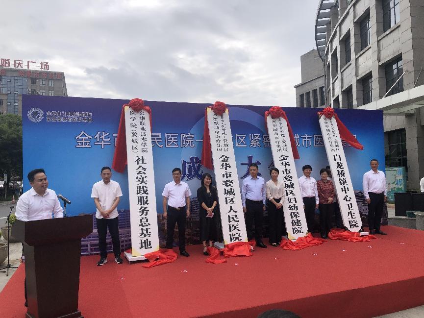 近日,金职院医学院与金华市人民医院、婺城区人民医院、婺城区妇幼保健院以及区属18家乡镇街道基层卫生院共同建设的“社会实践服务总基地”正式揭牌。
