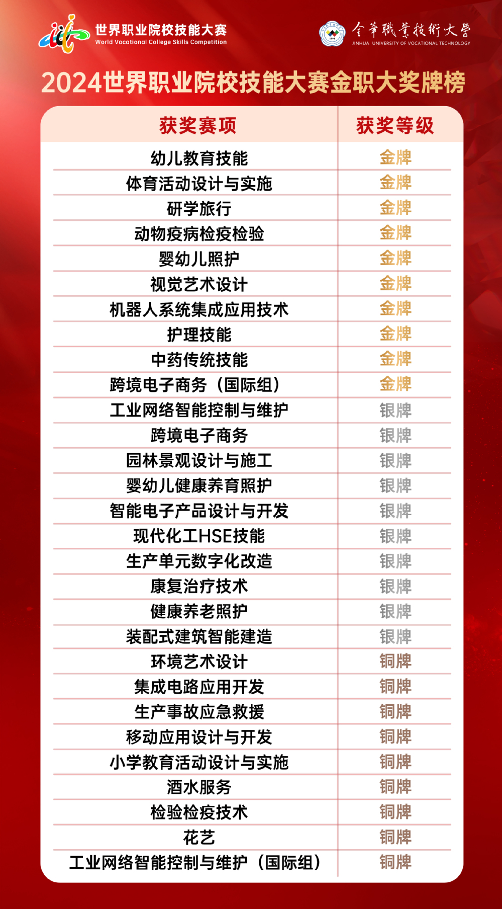 近日,2024世界职业院校技能大赛总决赛争夺赛各项比赛圆满结束。金华职业技术大学国内、国际组共30支参赛队伍凭借过硬的实力和出色的表现,荣获金奖10项、银奖10项、铜奖9项,金牌数和奖牌总数均位居全国前列。