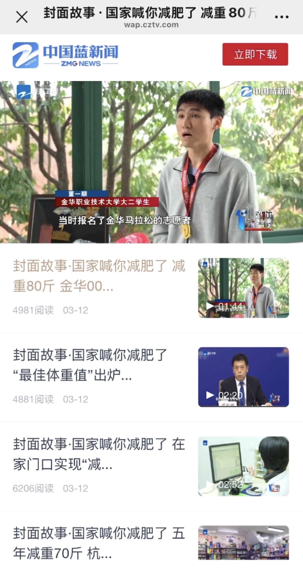 中国蓝新闻客户端:封面故事·国家喊你减肥了 减重80斤 金华00后大学生成马拉松跑者
