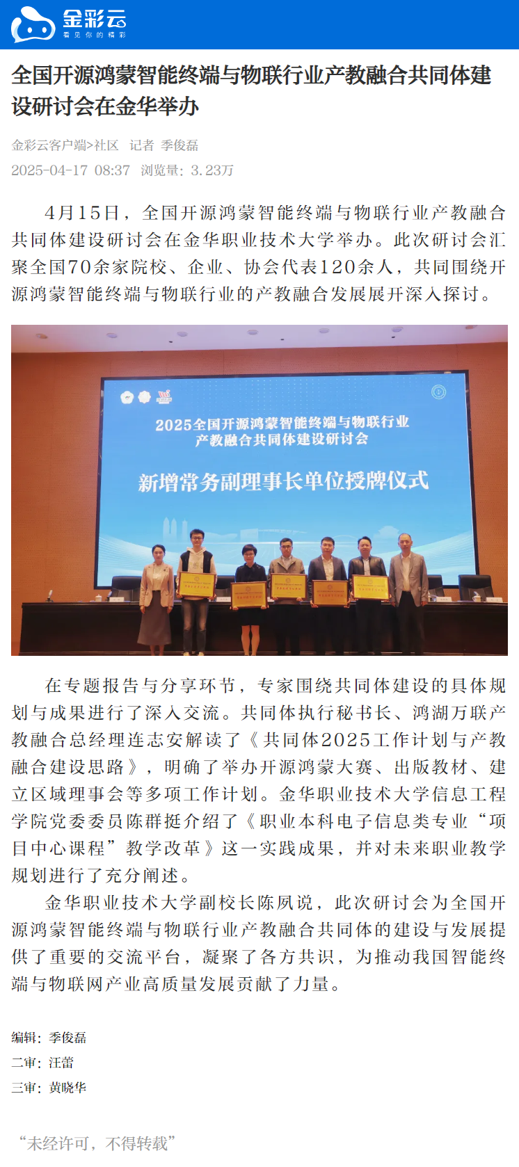 金彩云客户端:全国开源鸿蒙智能终端与物联行业产教融合共同体建设研讨会在金华举办
