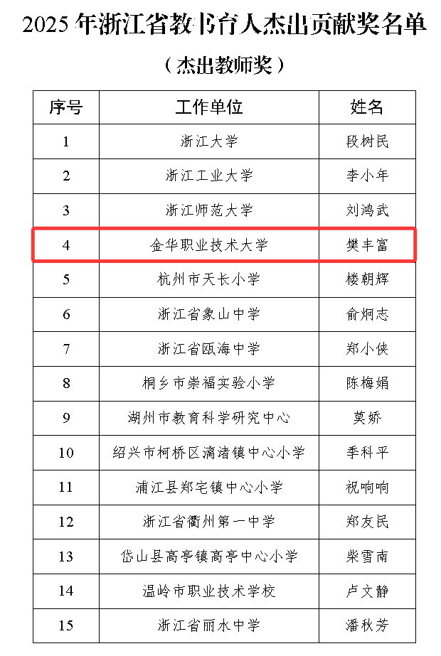 近日,浙江省教育厅公布2025年浙江省教书育人杰出贡献奖获奖名单,学校获省教学成果奖8项、省杰出教师奖1项,其中,教学成果奖获奖总数位居全省高职院校第一,省杰出教师奖全省高职唯一!