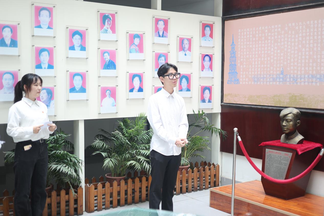 师范学院内的“革命先辈纪念馆”是红色精神的“传承课堂”,于2008年学院百年校庆时始建,2018年修缮升级。学生党员认真聆听钱兆鹏、吴振东、冯雪峰三位先辈的事迹。“先辈们的雕像不是陈列的展品,而是我们要刻进心里的‘教案’。”纪念馆内,学生党员们分组讨论着先辈事迹带来的触动。来自小学教育专业的学生党员黄俊源分享道:“吴振东烈士对小学教育工作的热爱和对儿童的关怀,让我深刻理解了‘献身’二字的分量,未来我将以他为榜样,用心呵护每一个孩子。”随后,全体学生党员齐声诵读“勤奋 朴实 献身 创造”的师范精神,铿锵有力的誓言回荡在纪念馆内。