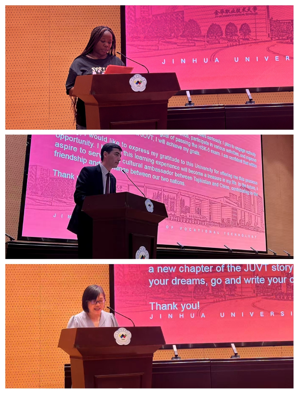 在校生代表、来自赤道几内亚的玛丽(ONDO ASANGONO MARI CRUZ ADUGU)分享了自己从汉语进修生到跨境电子商务专业本科生的成长经历,鼓励新生勇敢开口交流、积极参与校园活动,快速融入金职大这个温暖集体。
