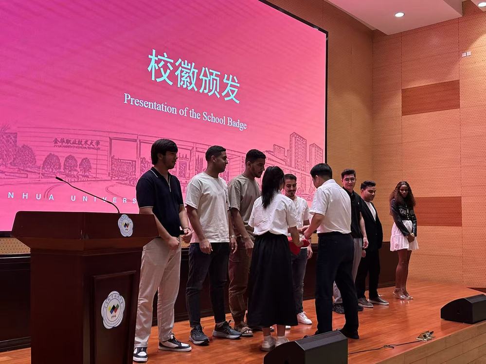 典礼现场举行了庄重的校徽颁发仪式。陈海荣为新生逐一佩戴校徽。校徽不仅是金职大学子的身份象征,更承载着薪火相传的使命担当,标志着59名国际新生正式成为金职大大家庭的一员。