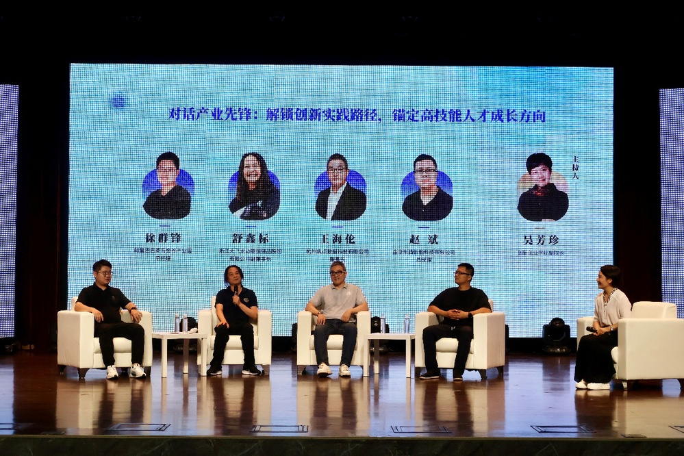 随后,四位嘉宾——浙江大飞龙动物保健品股份有限公司副董事长舒鑫标、杭州纵点数据科技有限公司董事长王海伦、阿里巴巴菜鸟金谷产业园总经理徐群锋、金华车猫智能科技有限公司总经理赵斌,在主持人的带领下,围绕“解锁创新实践路径,锚定高技能人才成长方向”的主题,展开了深度圆桌对话。