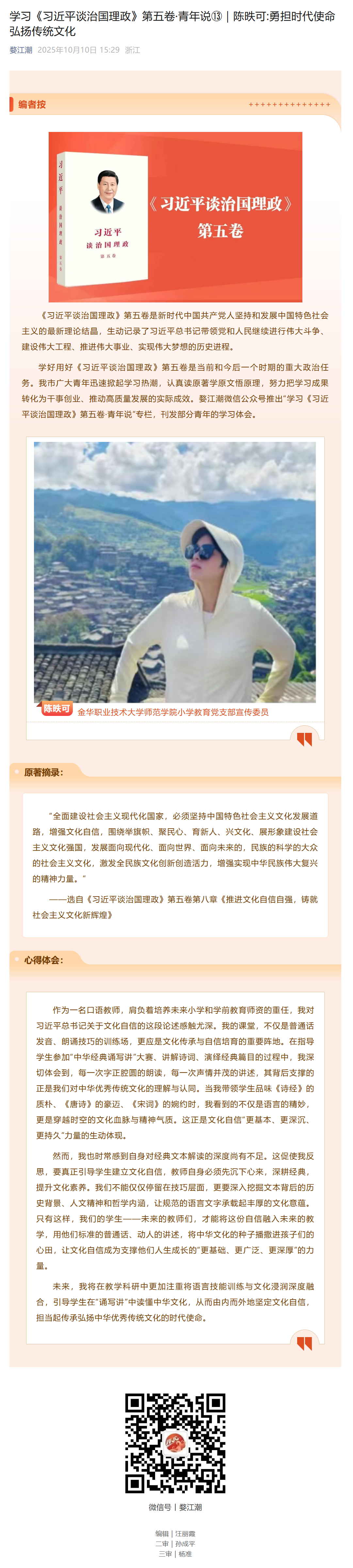 婺江潮:学习《习近平谈治国理政》第五卷·青年说⑬|陈昳可:勇担时代使命 弘扬传统文化