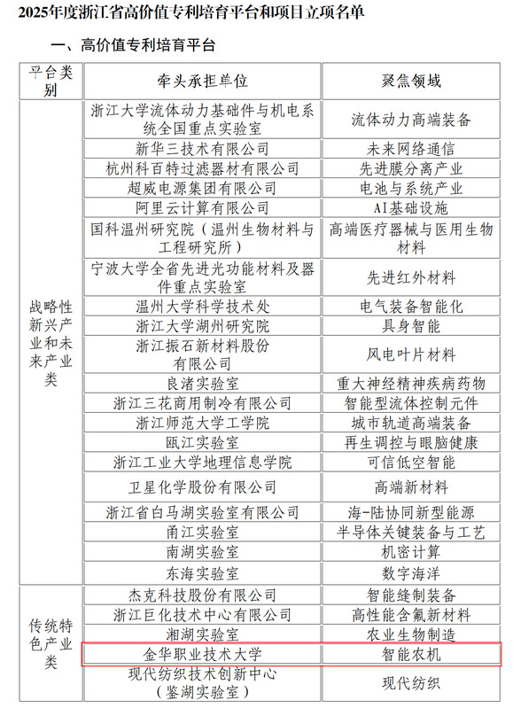 近日,浙江省市场监管局(浙江省知识产权局)公示了2025年度省高价值专利培育平台立项名单,学校丘陵山地特色作物智能农机高价值专利培育平台成功入选,是省内唯一一家依托高职院校建设的省级高价值专利培育平台,标志着学校在智能农机领域的专利创造、转化与布局能力获省级权威认可。