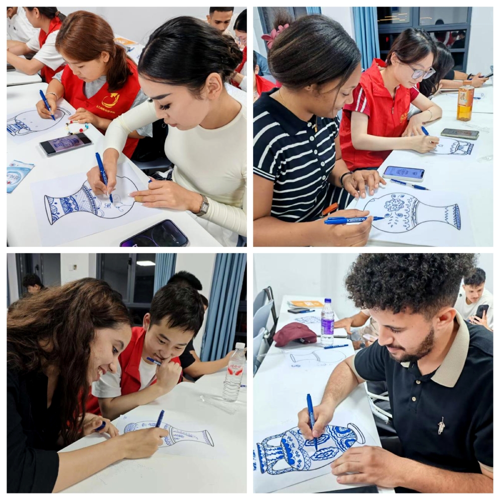 余音未绝,青花瓷韵接续上演。志愿者们为大家讲解了青花瓷的“前世今生”,以及缠枝莲、祥云、山水等经典纹样的美好寓意。从“青花缠枝莲纹的吉祥寓意”到“云纹的线条书写技巧”,志愿者们用通俗的语言讲解瓷纹背后的文化内涵与汉语言中的意象表达。随后,留学生们在志愿者的指导下化身“非遗传承人”,执笔青花,于素坯纸上悉心勾勒东方意蕴。笔触虽显生涩,专注却满含热情。有的临摹传统纹样,也有人将汉语诗句融入创作,在提笔与调墨间,亲身体验如何“以纹样讲述故事”。