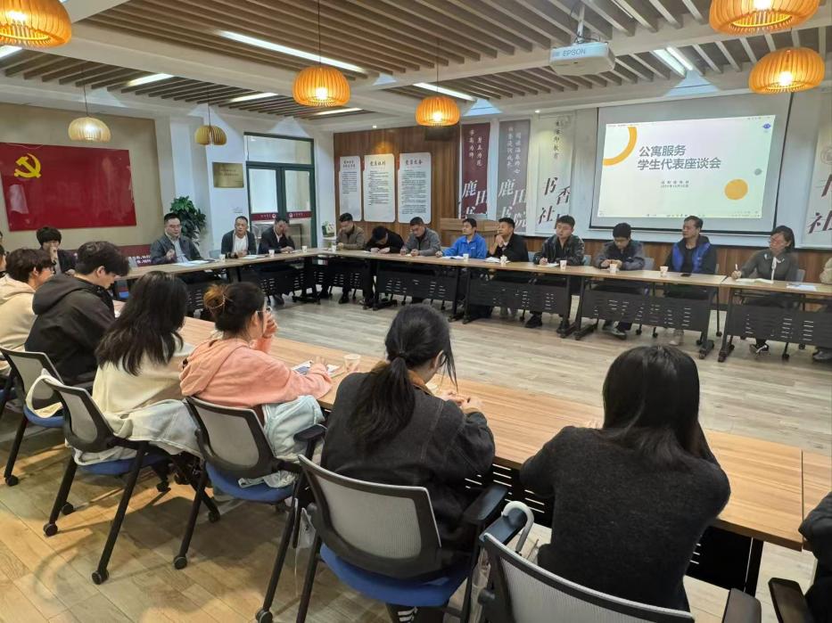 近日,学校后勤处楼寓管理科在学生公寓服务中心举办了公寓服务学生代表座谈会。此次会议邀请十余位来自学生会权益服务部的学生代表,校内洗衣机、空调、热水及直饮水等服务的第三方服务商负责人等共同参与。校园服务与保障中心相关负责人,室外保洁、教学楼及公寓片组组长参加会议。与会各方围绕公寓管理服务的优化问题,展开了全面深入的交流与探讨。