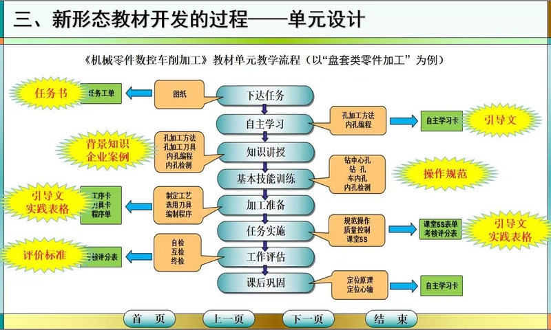 针对教材开发的具体流程,李银海介绍了“SWOP” (工作过程系统化方法),指出可按“企业岗位-工作任务-学习情境”的逻辑架构教材内容,他以《机械零件数控加工》《建筑施工图识读》等课程为例,详细展示如何落实基于真实生产项目和典型工作任务的单元设计。