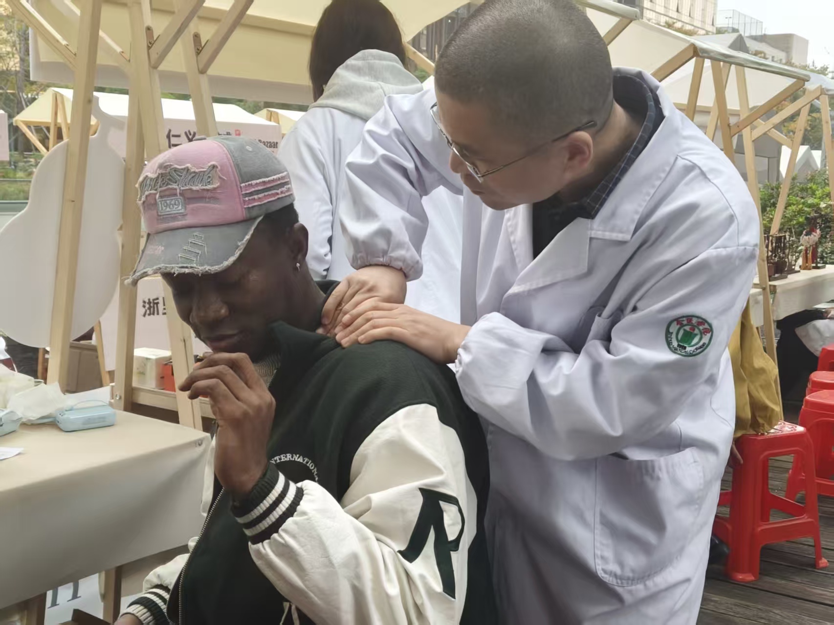 11月5日,医学院首次“丹溪故里 岐黄工坊”中医药文化集市在义乌市福田街道举行,这场充满中国传统医学特色的活动不仅吸引了周边居民前来打卡,还有不少外国友人也纷纷加入、大呼过瘾,共同开启了奇妙的中医药体验。
