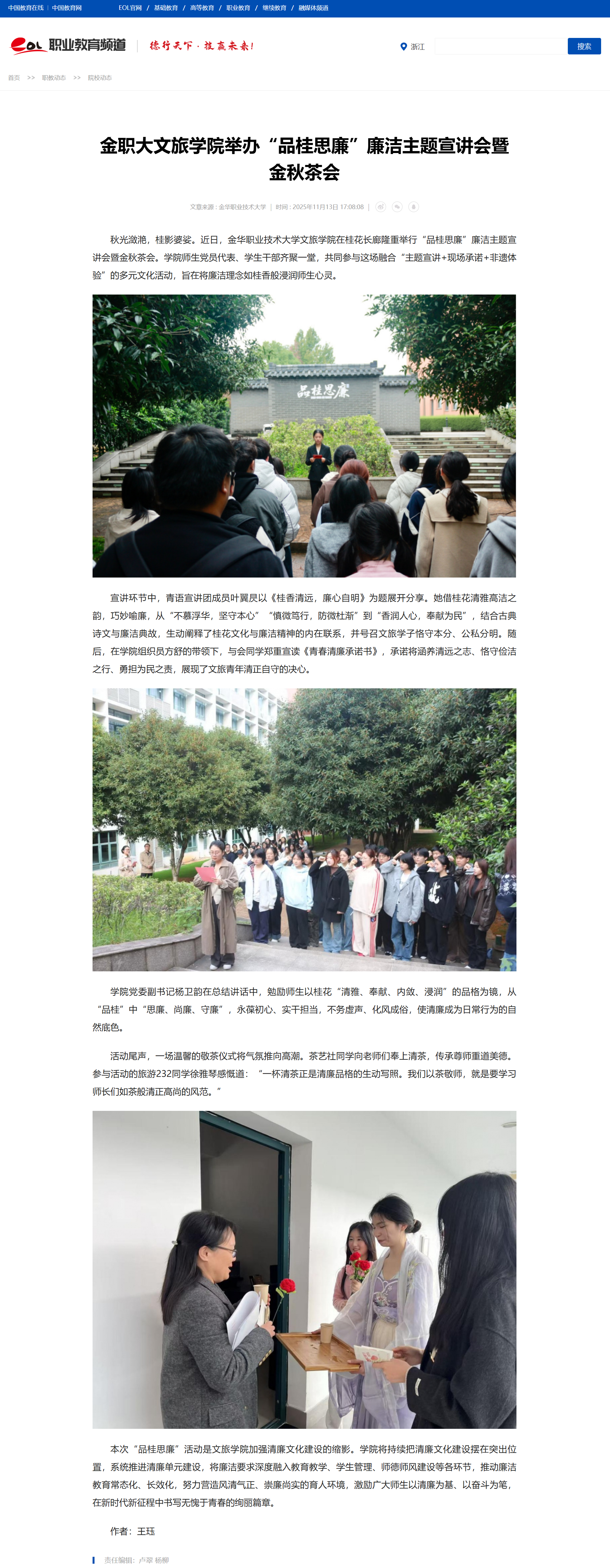 中国教育在线:金职大文旅学院举办“品桂思廉”廉洁主题宣讲会暨金秋茶会