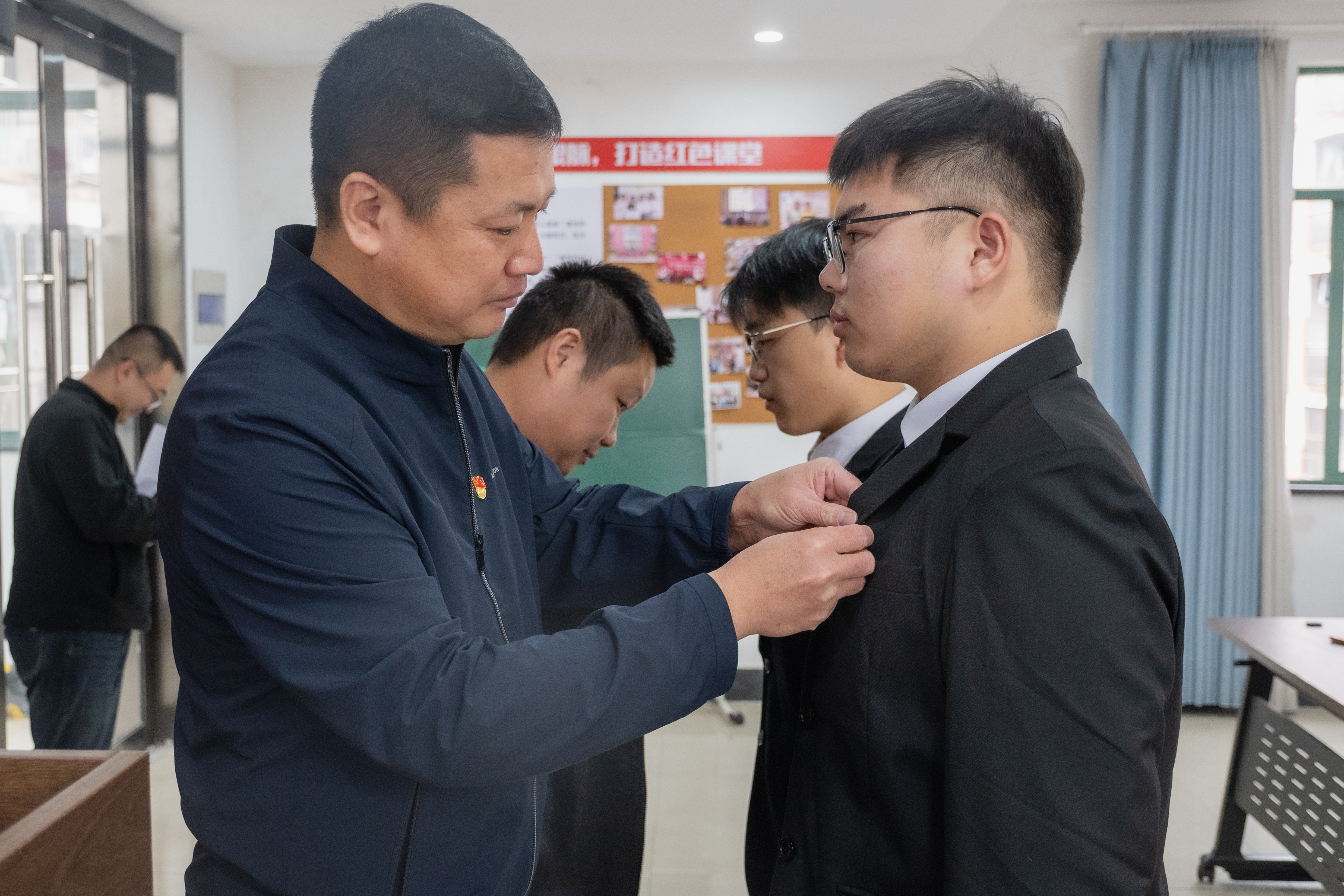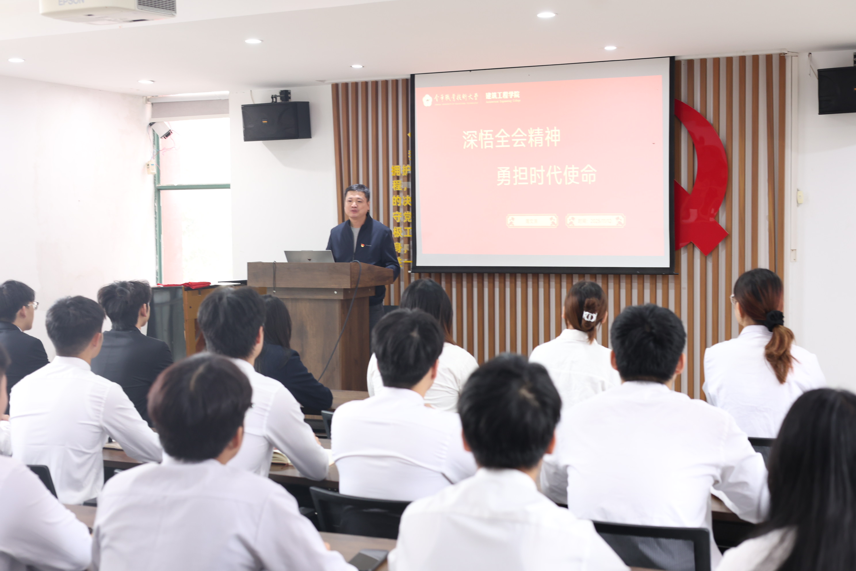 活动以一场庄严的宣誓仪式拉开序幕。学院党委副书记为2025年秋季新发展的学生预备党员代表规范佩戴党徽,并勉励他们亮明身份、牢记职责。随后,全体预备党员面向鲜红党旗,举起右拳庄严宣誓,铿锵有力的誓言在红砖家园内回荡,展现了青年党员坚定不移的理想信念。随后,紧密结合建筑专业特色,学院党委副书记对二十届四中全会精神进行深入解读。他指出,全会审议通过的“十五五”规划建议中明确提出的“推进新型城镇化和乡村振兴”、“构建现代化基础设施体系”等重大任务,为建工学子提供了施展才华、报效国家的广阔舞台。他强调,全会所倡导的“高质量发展”和“新质生产力”,正具体体现在智能建造、绿色施工等专业领域的前沿实践中。