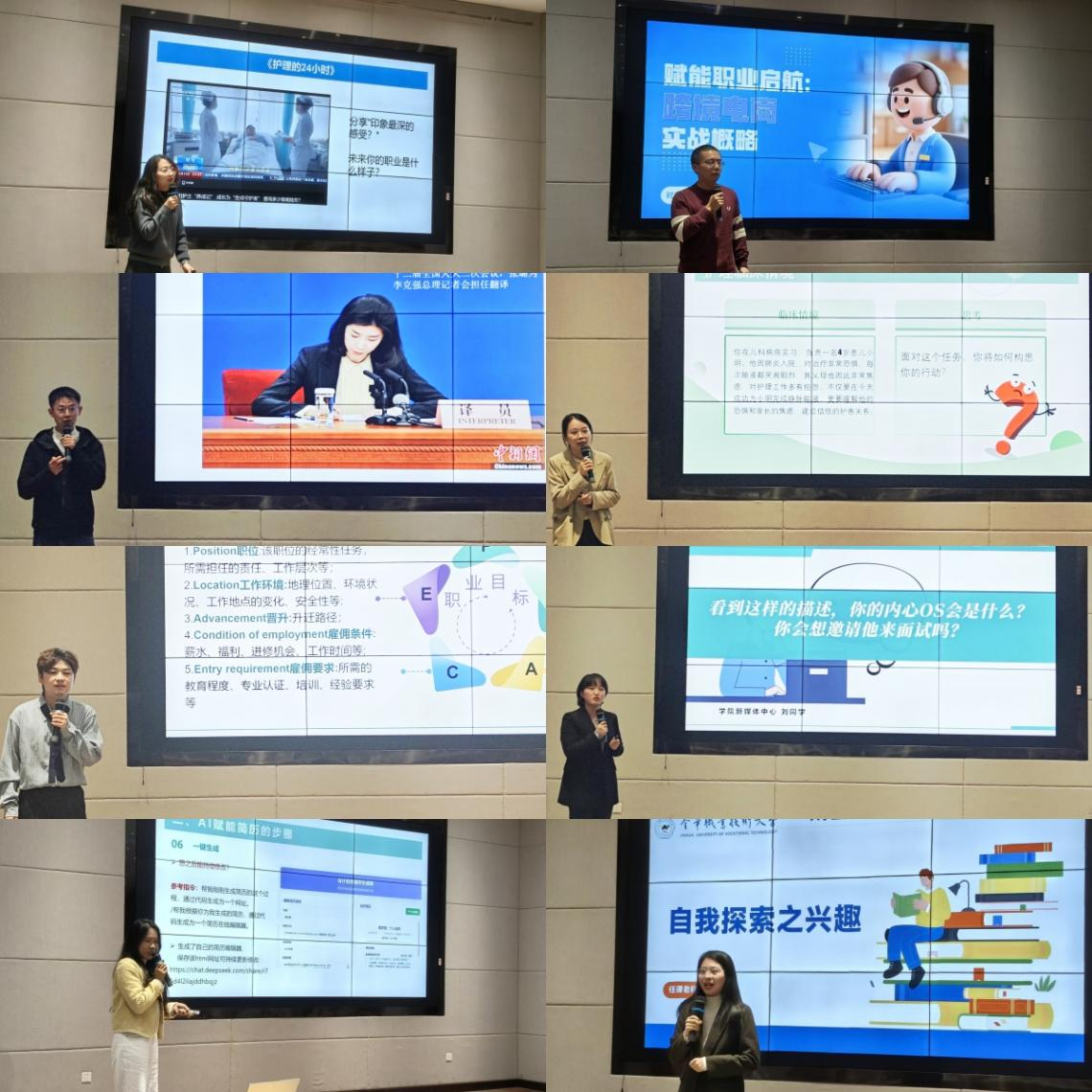 决赛现场,参赛教师以“无生授课”形式进行了8-10分钟的模拟课堂教学展示。参赛主题紧贴学生需求,聚焦时代前沿,内容丰富且具针对性。从引导学生内在驱动的 “探索兴趣密码”,到赋能学生职业发展的 “职业技能探索”;从富有实践意义的 “生涯人物访谈” ,到直击求职实战的 “USP和AI赋能求职” 。一系列新颖而务实的主题,生动反映了我校就创课程教学内容的广度、深度与时代温度,也贯穿“以学生为中心”的教学核心理念,体现了教师们对职规、就业课程教学的深入思考与实践。