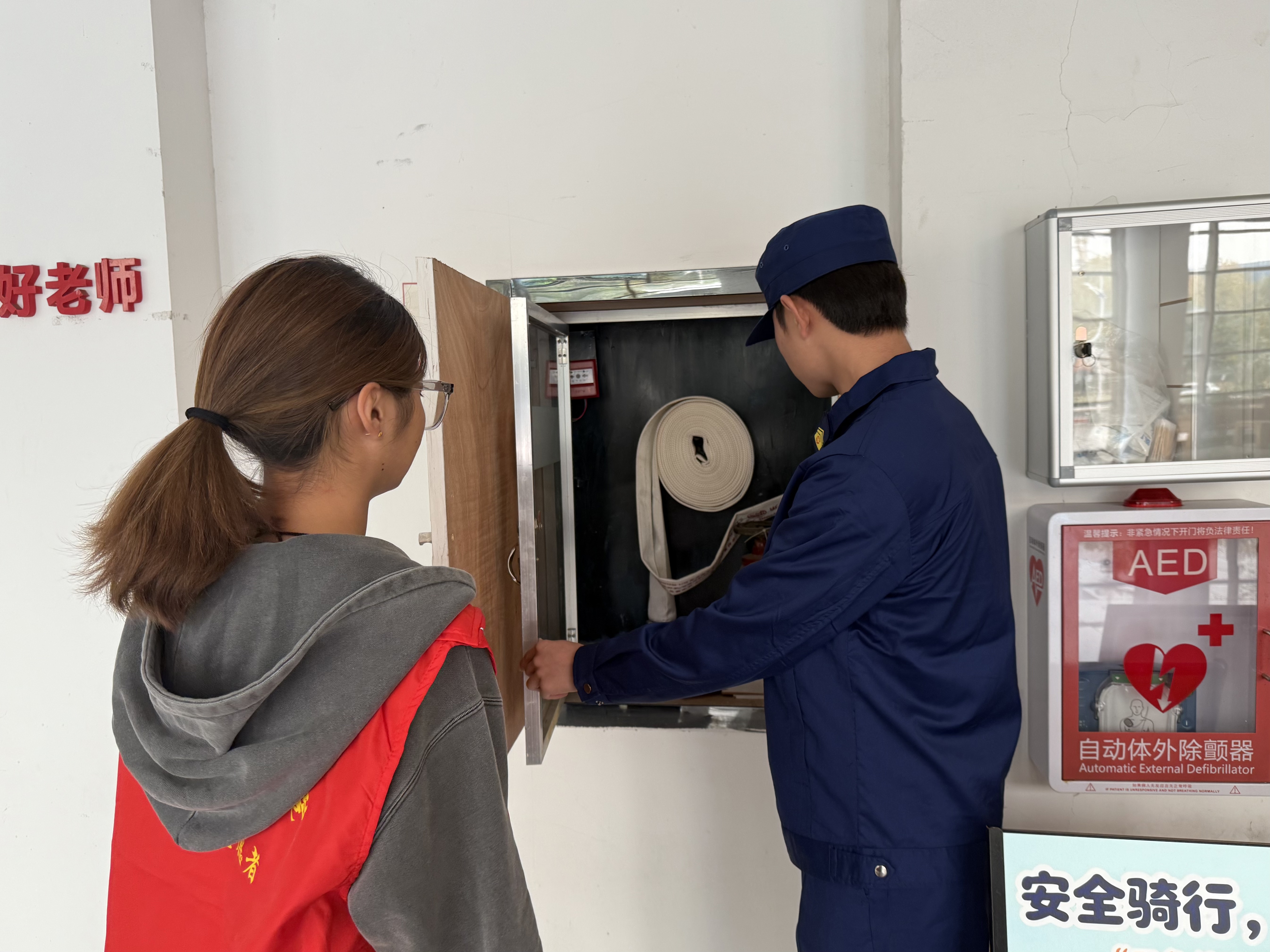回到最熟悉的校园,叶俞骏对曾经的教学楼和“一站式”学生社区都做了详细的检查,逐一指明其中存在的潜在隐患。与此同时,他还对灭火器、消防栓等关键设施进行了现场讲解。他俯身示范灭火器的使用步骤,动作熟练且沉稳,在操作的同时着重强调:“提拔握压,这四个步骤不可出错,在关键时刻能够挽救生命。”此外,他提醒同学们要爱护这些“沉默的守护者”,切勿在其下方堆放杂物或者随意触碰,以便在需要时能够正常使用。