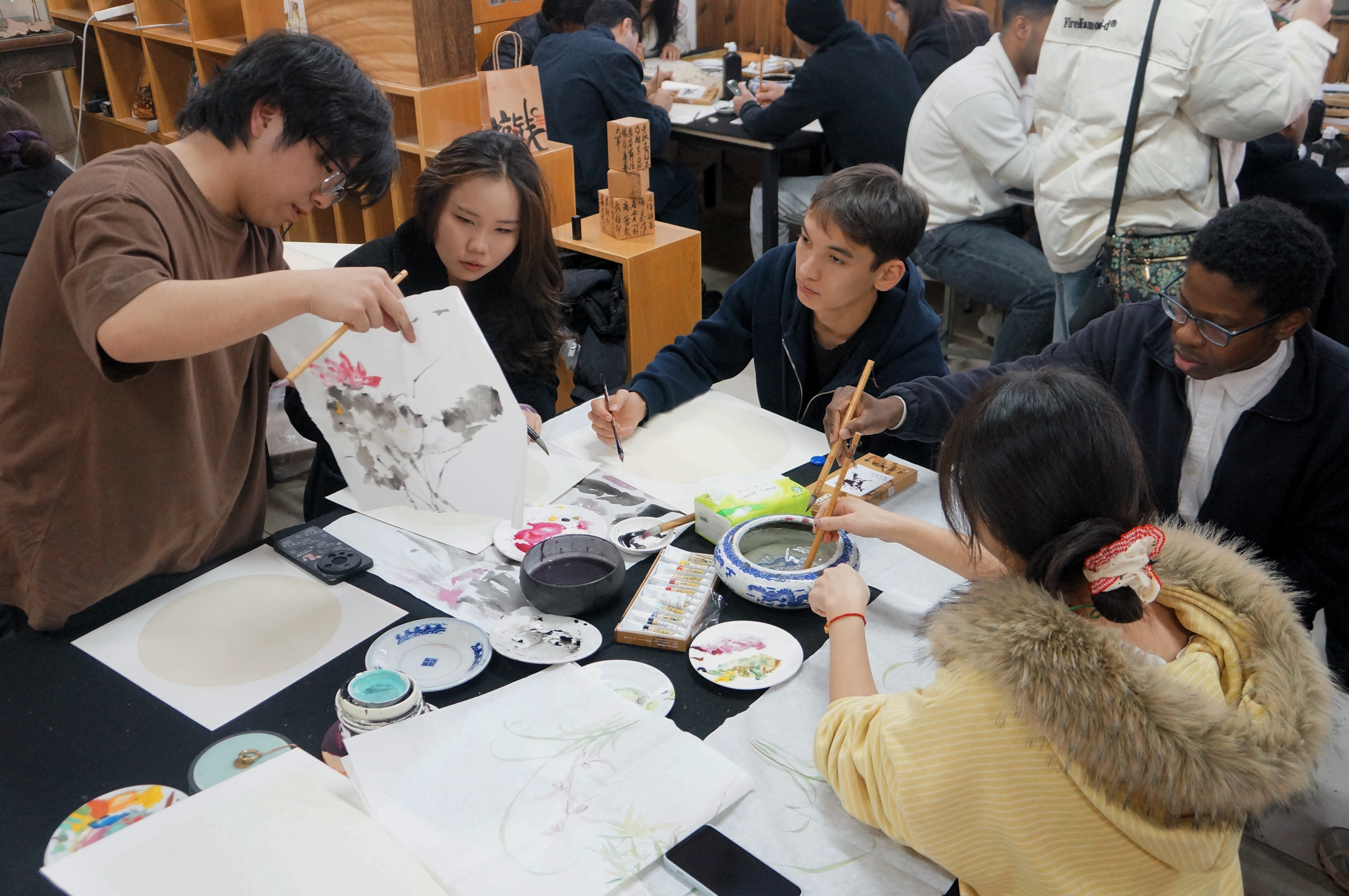 理论讲解后,进入体验环节。会场分为书法体验区和国画体验区,点墨书画社的同学们化身“老师”,进行一对一的创作指导。在书法区,外籍师生们饶有兴致地临摹着“福”、“友” 等充满美好寓意的汉字,在一横一竖、一撇一捺中感受中国文字的架构之美。在国画区,大家尝试描绘梅兰竹菊的君子风骨,或是勾勒金华市花茶花的娇艳姿态。整个会场气氛热烈,中外师生在笔墨交融与手作时光中迅速拉近了距离。