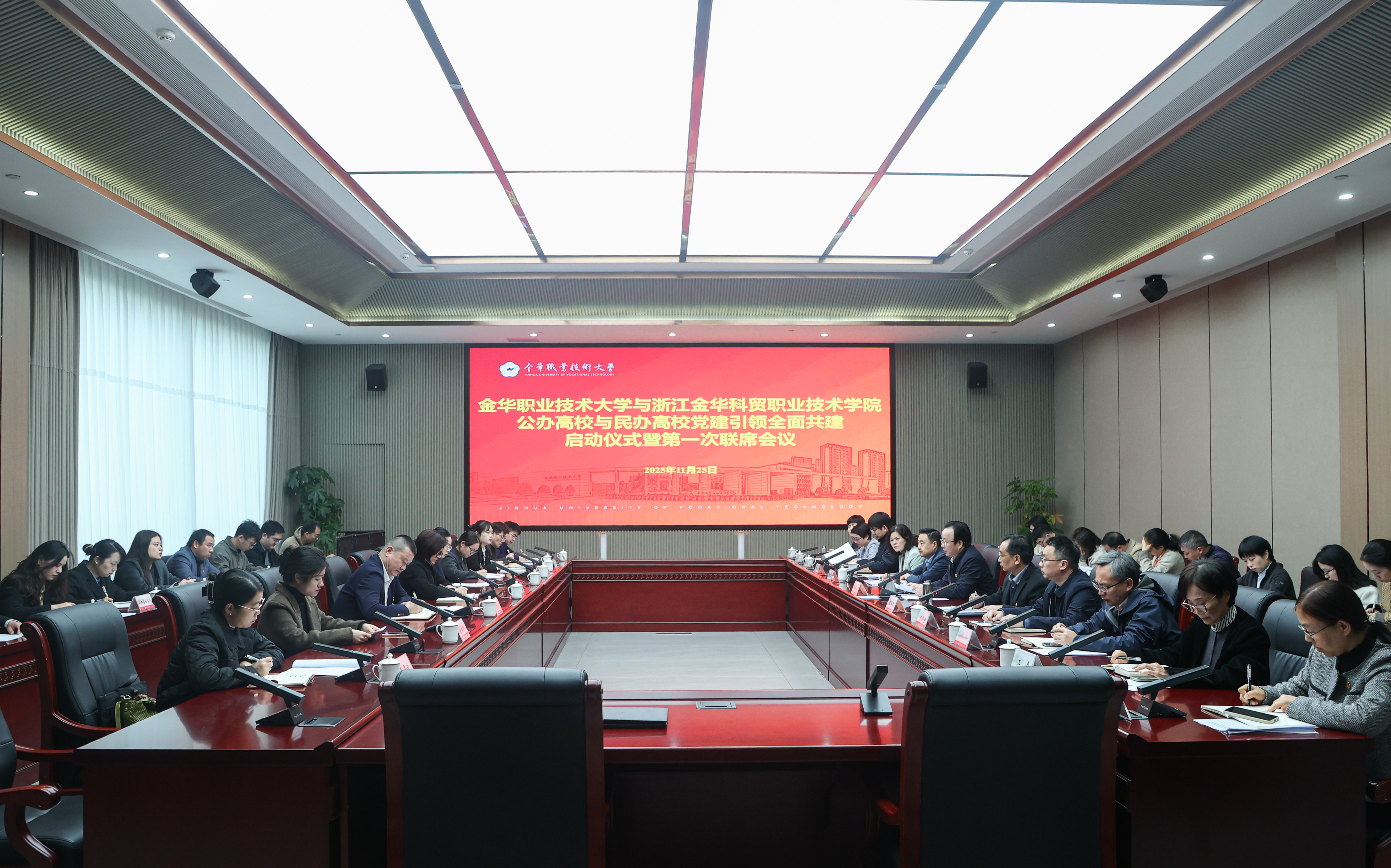 为深入贯彻全国全省高校党的建设工作会议精神,认真落实省委教育工委关于推动公办与民办高校党建引领全面共建的部署要求,11月25日,金华职业技术大学与浙江金华科贸职业技术学院党建引领全面共建启动仪式暨第一次联席会议在金华职业技术大学明学会议室举行。金华职业技术大学党委书记王振洪,党委委员、组织部部长董晓晨,浙江金华科贸职业技术学院党委书记金娴,党委委员、组织部部长、工会主席胡阳婧出席会议。两校相关职能部门和二级学院党委负责人参加会议。会议由金华职业技术大学党委副书记楼伟民主持。