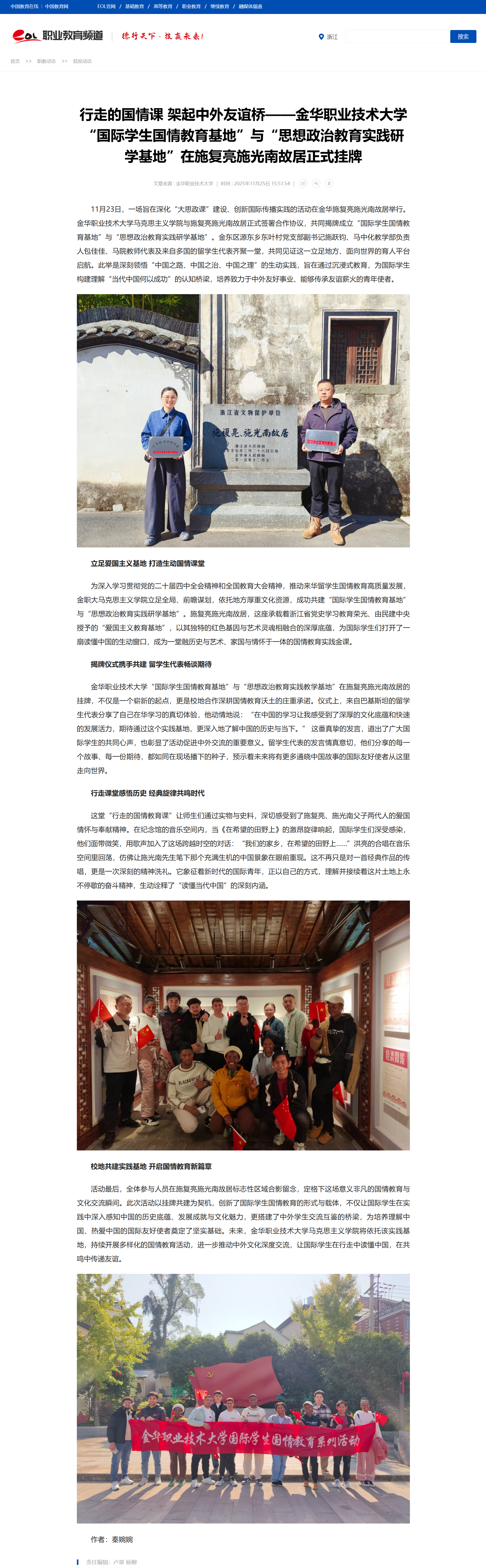 中国教育在线:行走的国情课 架起中外友谊桥——金华职业技术大学“国际学生国情教育基地”与“思想政治教育实践研学基地”在施复亮施光南故居正式挂牌