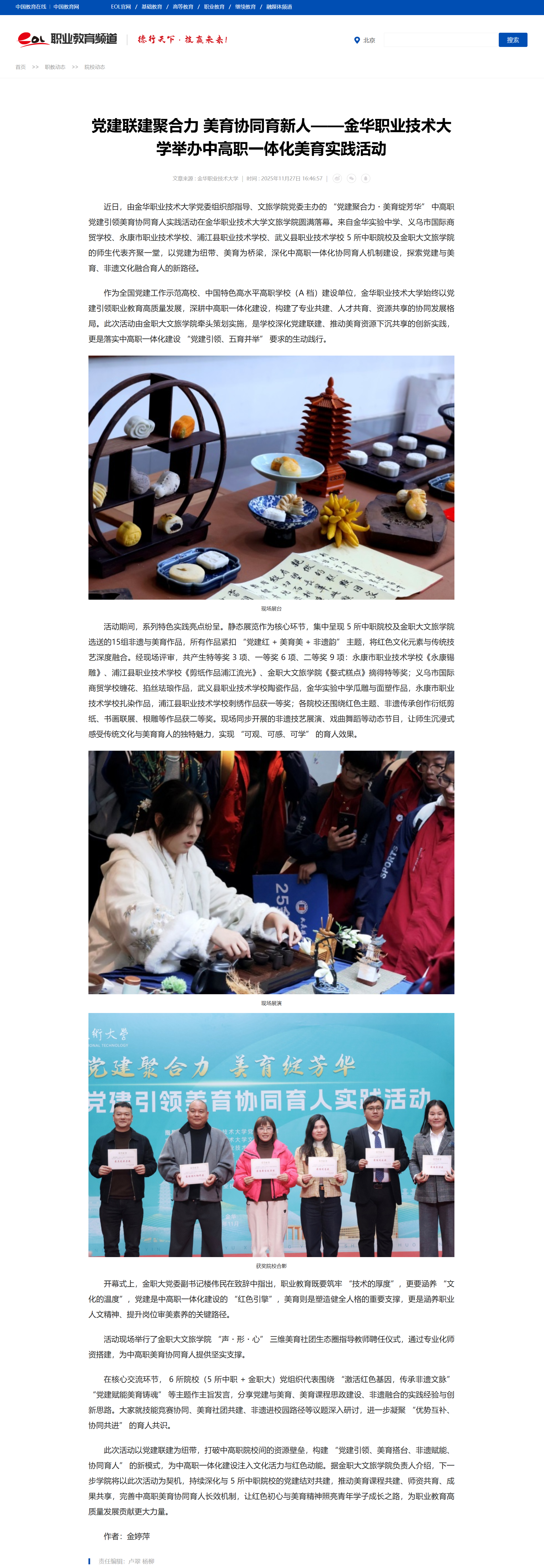 中国教育在线:党建联建聚合力 美育协同育新人——金华职业技术大学举办中高职一体化美育实践活动