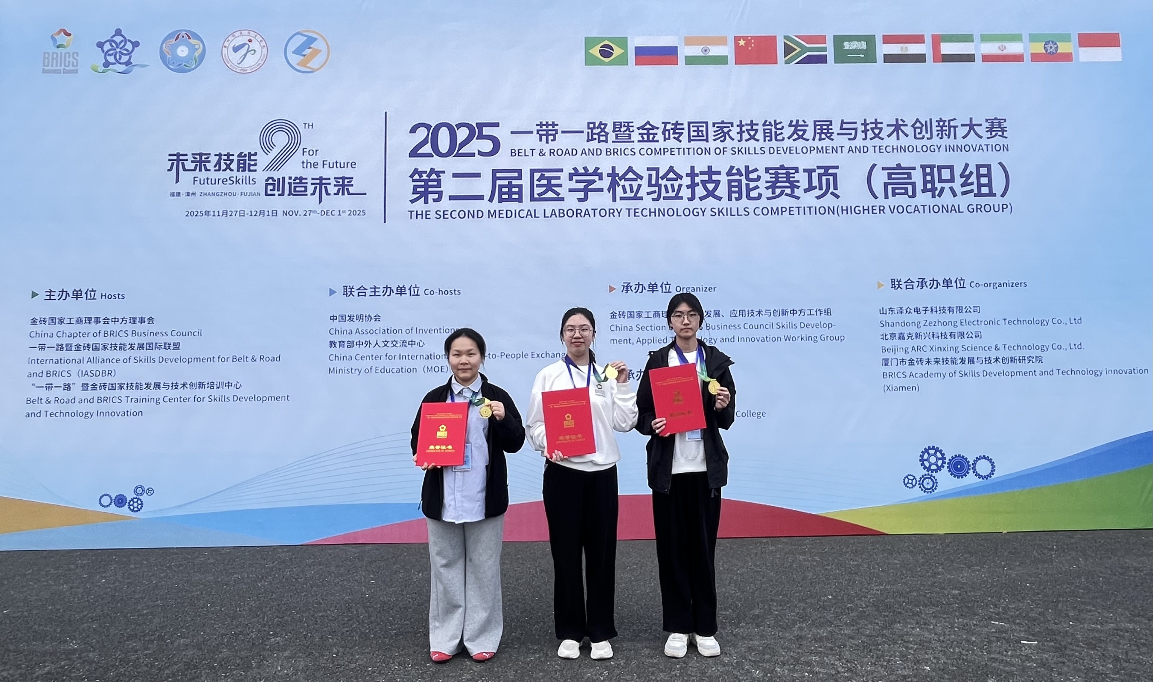 11月28日至30日,2025一带一路暨金砖国家技能发展与技术创新大赛第二届医学检验技能赛项(高职组)在漳州卫生职业学院圆满落幕。由金华职业技术大学医学院教师楼宏强领队,冯凤玲、曾小平指导,傅昌悦、陈姝均、孙艺嘉三位同学组成的代表队凭借扎实的专业功底与娴熟的实操技能,从全国众多参赛队中脱颖而出,斩获比赛一等奖,同时学校获评“最佳组织奖”。