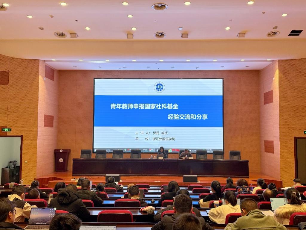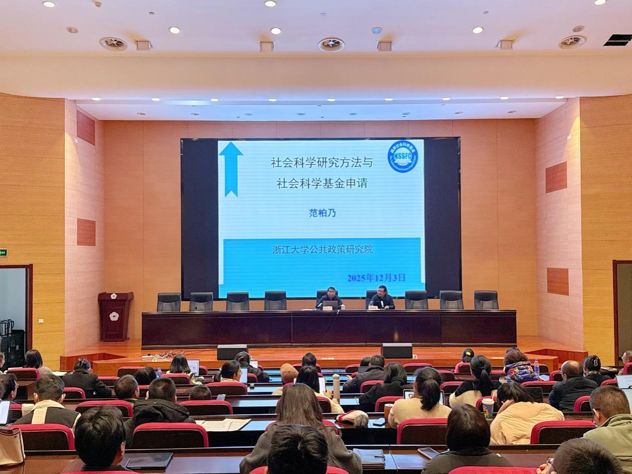 为精准赋能教师科研成长,助力学校在国家社科基金项目申报中实现质的突破,近日,由科技处与师范学院联合主办的国家社科基金申报专题指导讲座在学校顺利举行。本次讲座特邀浙江大学公共政策研究院范柏乃教授、浙江外国语学院郭筠教授担任主讲嘉宾,学校党委副书记劳虓虓出席并讲话,全校百余名青年教师及科研骨干参会聆听。