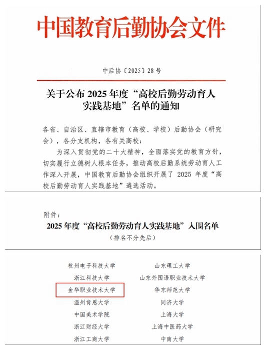12月11日,中国教育后勤协会正式公布2025年度“高校后勤劳动育人实践基地”名单,全国共80所院校获此殊荣。金华职业技术大学凭借扎实的劳动育人实践与创新体系,成功入围,成为本年度浙江省唯一入选的高职院校。