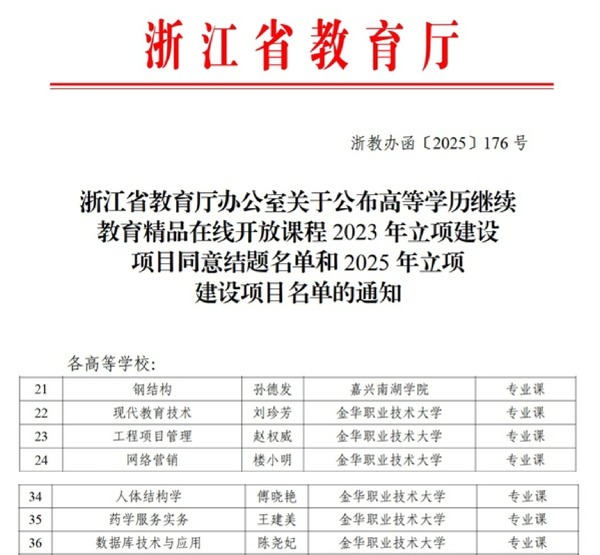 近日,浙江省教育厅公布高等学历继续教育精品在线开放课程建设项目评审结果。金华职业技术大学申报的课程迎来“双喜临门”:三门课程顺利通过2023年建设项目结题验收,同时满额申报的三门课程成功获批2025年立项建设项目。