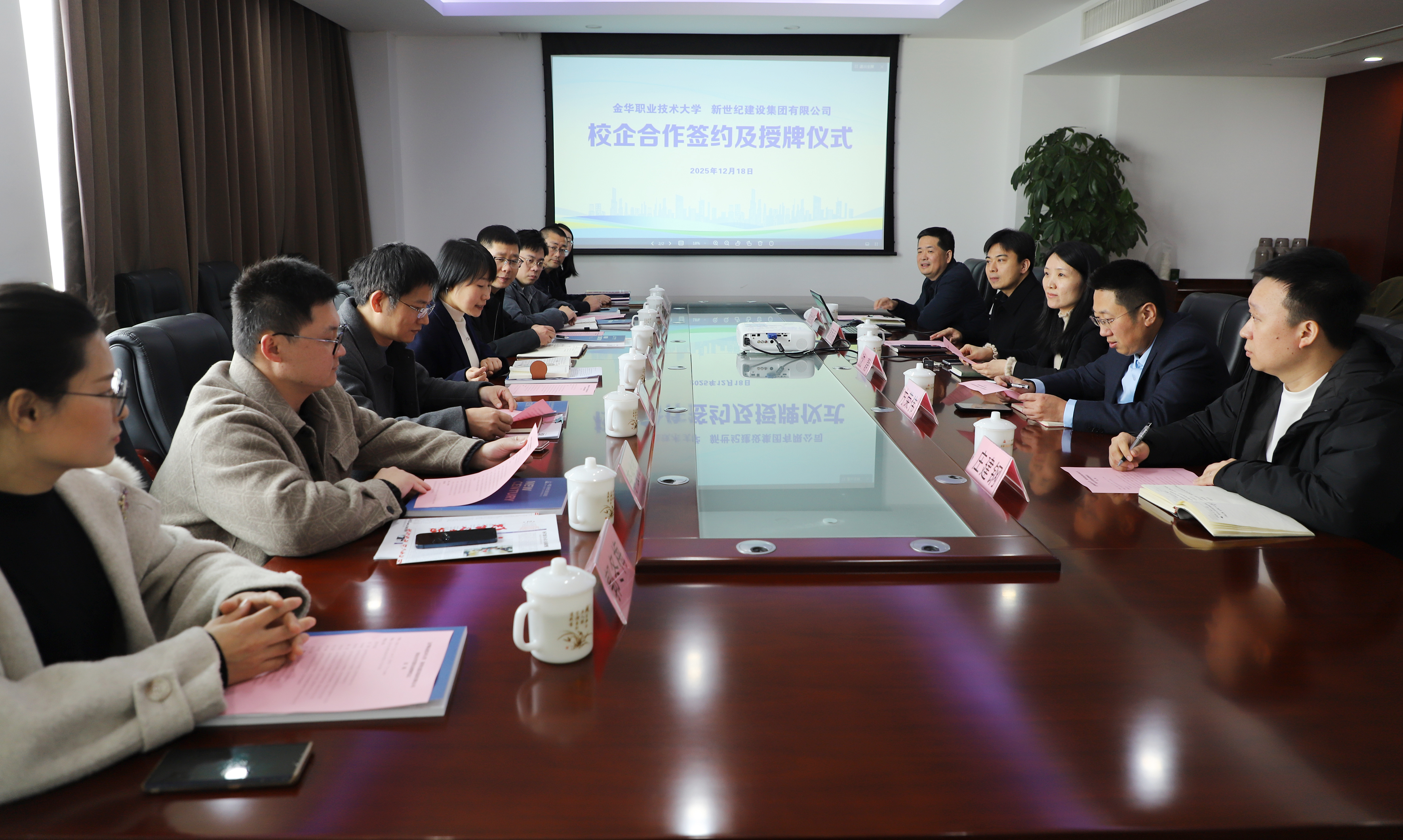 为深入推进“五一融联”建设,深化产教融合、强化校企协同育人,助力金华市建筑行业高质量发展,12月18日,金华职业技术大学建筑工程学院与新世纪建设集团有限公司隆重举行校企合作签约及授牌仪式。建筑工程学院党委书记徐婧、副院长朱锋盼及各专业负责人,新世纪建设集团有限公司党委书记沈静、副总裁方荣伟等领导及核心骨干出席仪式。